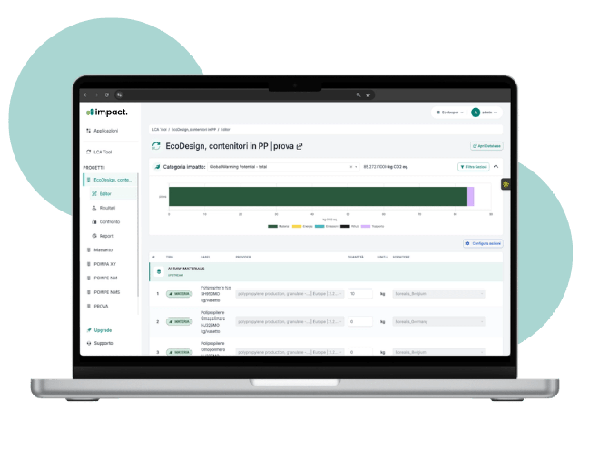 Sustainability management software featuring integrated modules for LCA, Ecodesign, EPD, Carbon Footprint (CFP&CFO), VSME and consumption monitoring. We transform environmental data from products and operations into strategic insights and sustainable decisions.